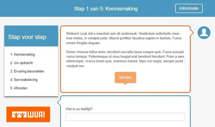 WUA voert jaarlijks vele benchmark onderzoeken uit. In deze onderzoeken gebruikt WUA vaak een online vragenlijsten als hulpmiddel om te beoordelen hoe consumenten websites ervaren. Met Novusoft is WUA in staat zijn om snel nieuwe onderzoeken te kunnen opzetten en vragenlijsten te maken die door vele deelnemers tegelijk ingevuld kunnen worden.